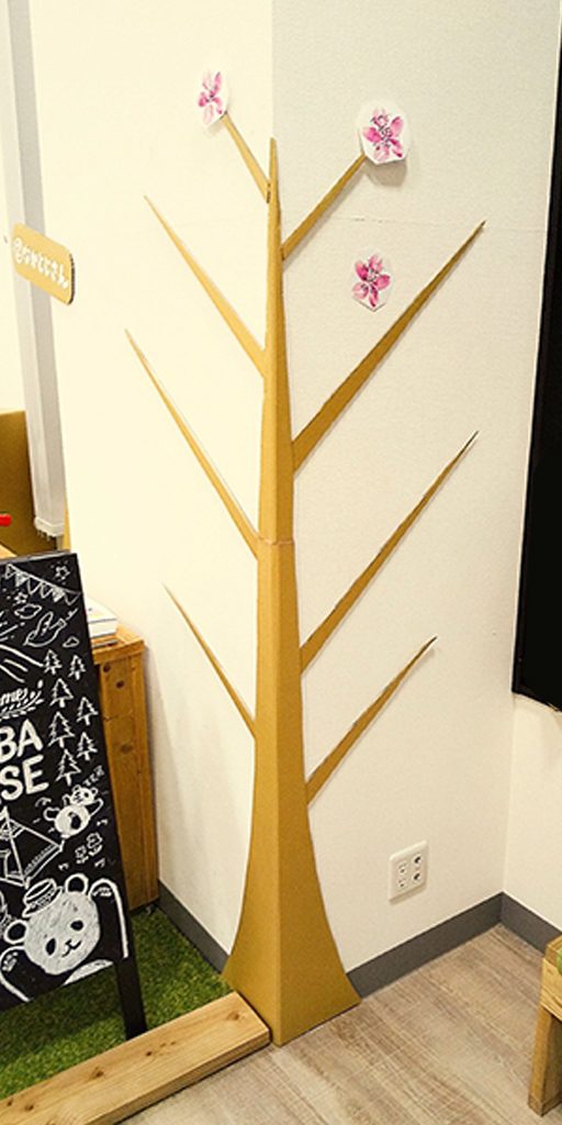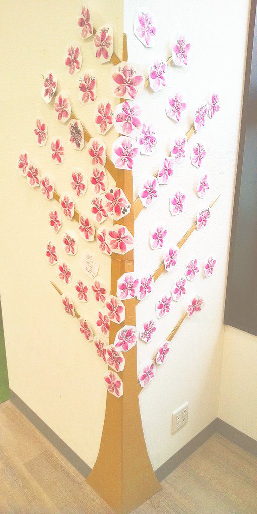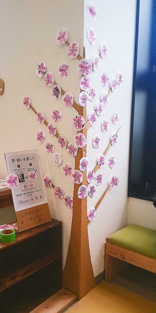 桜の幹をあしらった壁面に貼ってもらい、満開にしてしまおうというもの。